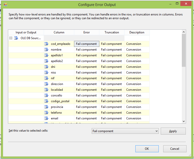 SSIS a nivel de cada campo contempla las posibilidades de «Error» y de «Truncation» y en este cuadro de diálogo le diremos qué debe hacer:
