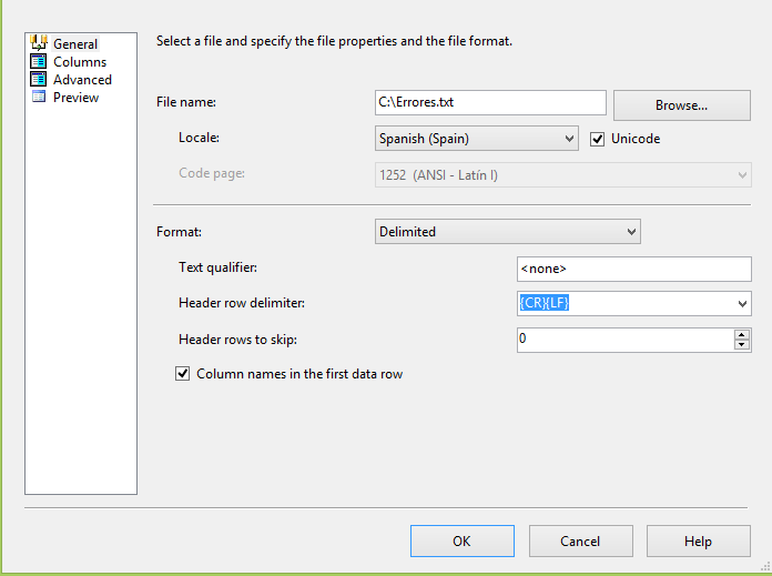 Para nuestro caso seleccionaremos en todos los campos la opción «Redirect row» para que en caso una fila tenga en un campo un valor erróneo o que se produzca un truncamiento de datos, nos guarde ese fila o registro en un fichero de texto.