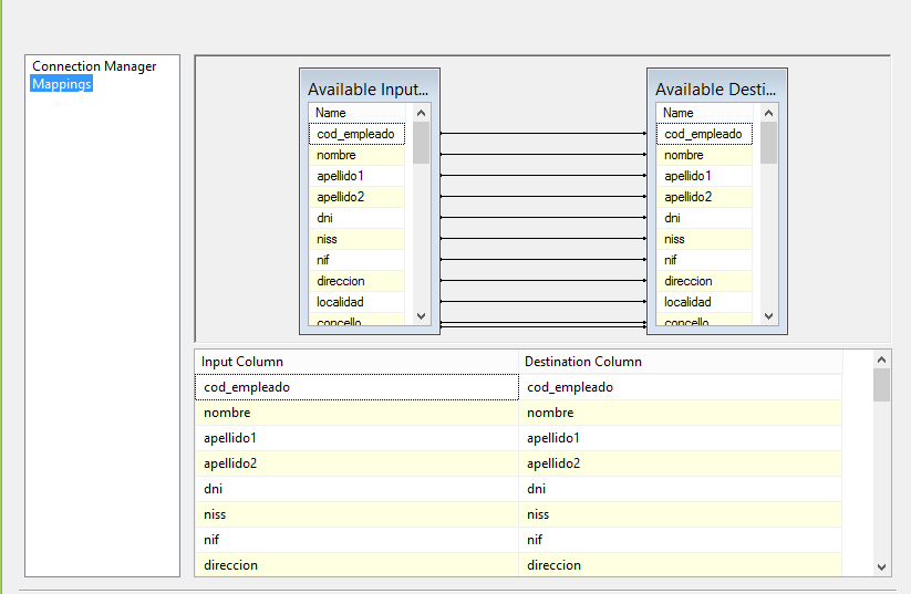 Una vez finalizado, aceptaremos y revisaremos en «Mappings» que la asignación de los campos sea correcta en el momento que se guarde una determinada fila en el fichero. Además en caso de que no queramos guardar un determinado campo en el fichero podemos ignorarlo.