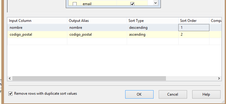 Además disponemos de la opción «Remove rows with duplicate sort values» que eliminará filas con valores duplicados en el momento de realizar la ordenación.